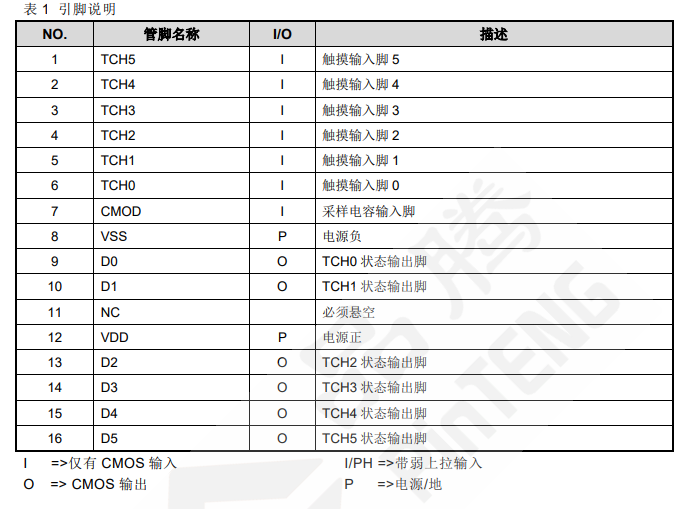 ● 芯片采用一对一直接输出,未按键时为高电平输出,按键为低电平输出