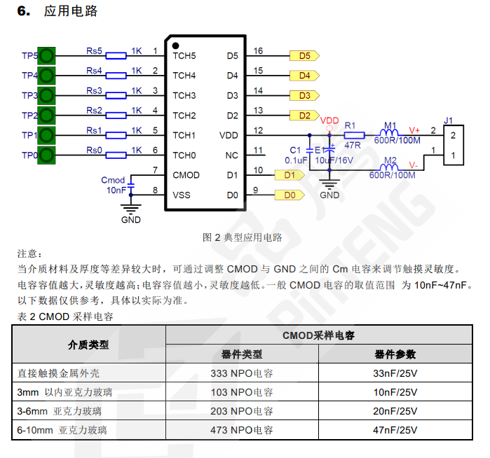 ● CMOD 脚外接电容可调节灵敏度,电容越大灵敏度越高