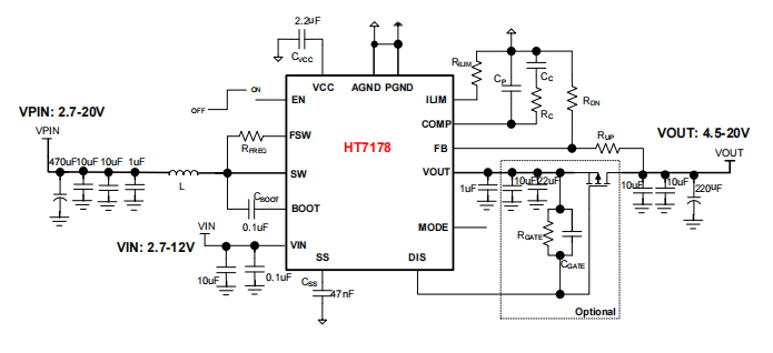 产品名称:HT7178 带输出关断的20V,14A全集成同步升压转换器