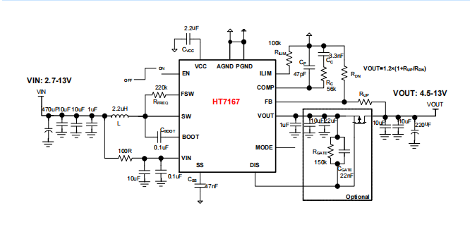 HT7167具有2.7V至13V宽输入电压范围,可为采用单节或两节鲤电池的应用提供支持。该器件具备12A开关电流能力,并且能够提供13V的输出电压。