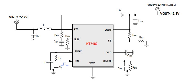 HT7180具有2.7V至12V宽输入电压范围,可为采用单节或两节鲤电池的应用提供支持。该器件具备10A开关电流能力,并且能够提供高达12.8V的输出电压。