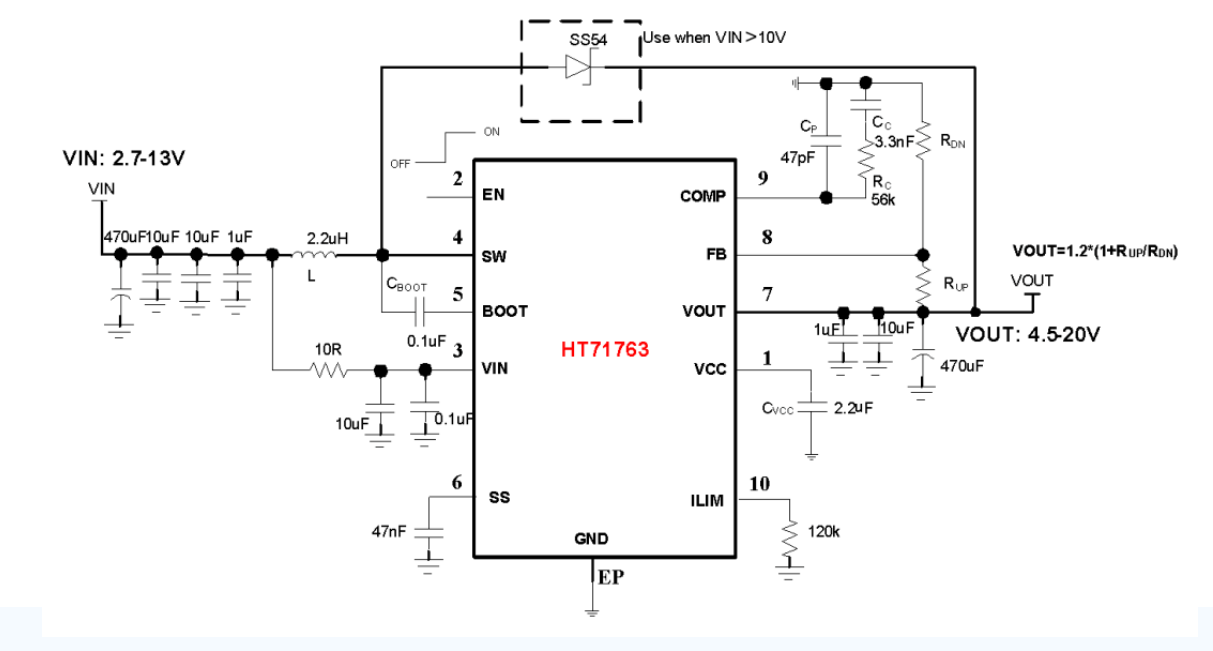 HT71763具有2.7V至20V宽输入电压范围,可为采用单节或两节锂电池的应用提供支持。该器件具备15A开关电流能力,并且能够提供20V的输出电压。