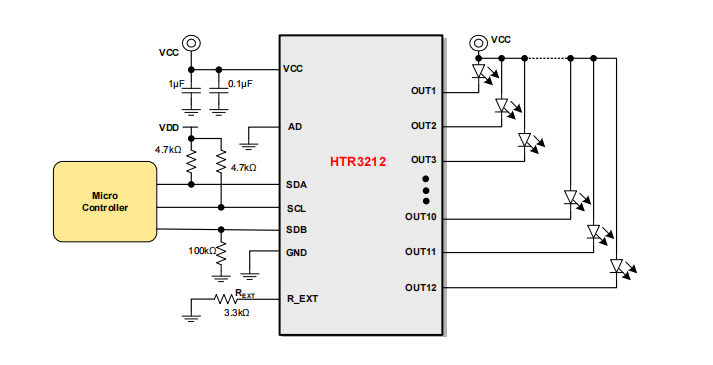 HTR3212是一款12路LED PWM驱动器,PWM频率可固定为3kHz或22kHz。每一路最大输出电流可通过外置电阻REXT调节,最大38mA,并可独立控制4档可选。每一路可通过I2C单独控制256级细腻亮度调节。