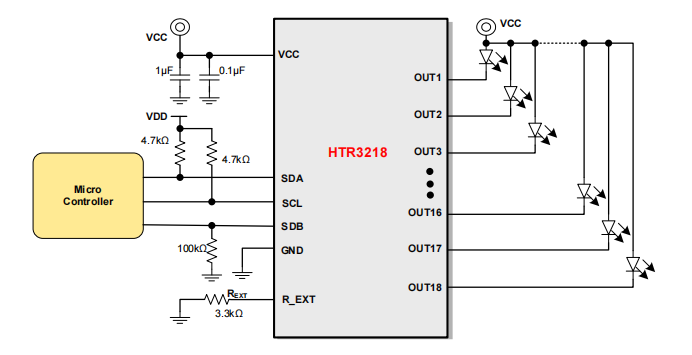 主控器件通过I2C接口对HTR3218进行编程控制,通过将SDB脚拉低或软件设置可关断芯片,进入低功耗模式。