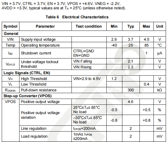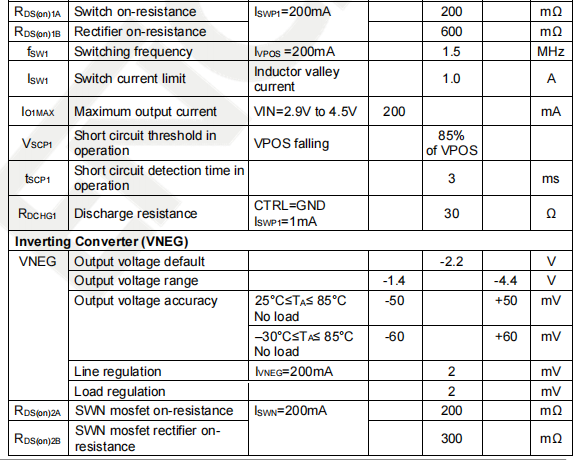 rails. It integrates an 200mA step-up converter VPOS, an 200mA inverting converter VNEG and an 20mA