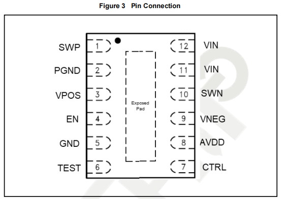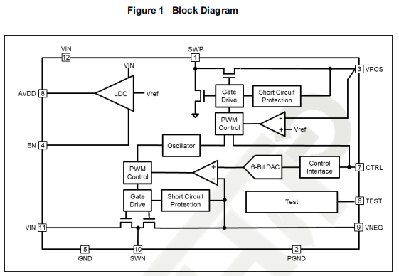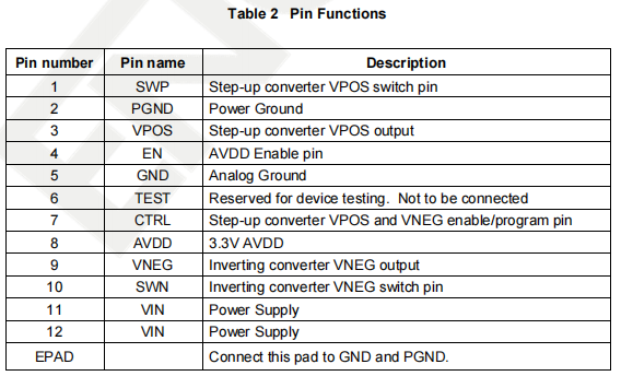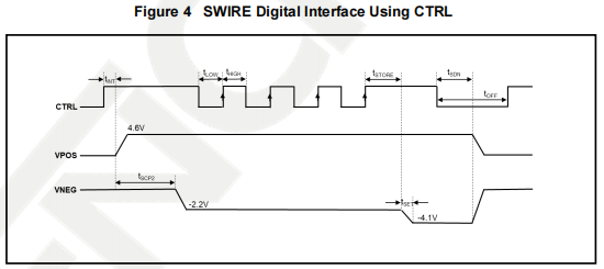 The CTRL pin serves two functions: one is to enable and disable the device VPOS and VNEG,