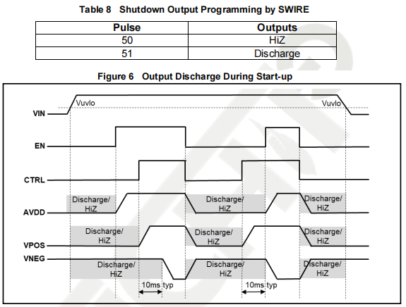 The device outputs can be programmed for Discharge or HiZ during shutdown. Figure 6 shows