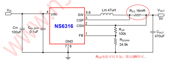 NS6316 内置线电压补偿,可通过调节 FB 端口的分压电阻阻值来实现。NS6316 不仅可实现单芯片 降压电源管理方案,还可以与 QC2.0/ QC3.0 识别芯 片构成快速充电电源管理方案。另外,芯片包含多重保护功能:过温保护,输出短路保护和输入欠压/ 过压保护等。