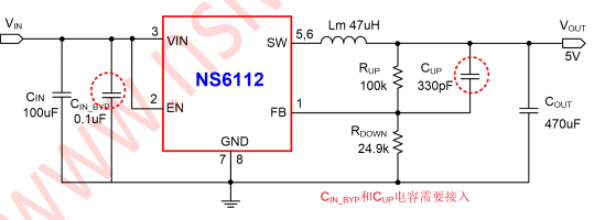 NS6112 内置线电压补偿,可通过调节 FB 端口的分压电阻阻值来实现。NS6112 不仅可实现单芯片降压电源管理方案,还可以与 QC2.0/ QC3.0 识别芯片构成快速充电电源管理方案。另外,芯片包含多重保护功能:过温保护,输出短路保护和输入欠压保护等。