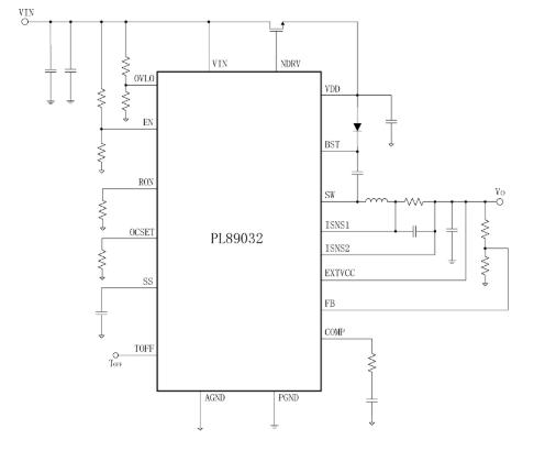 PL89032 的开关频率可以从50kHz 编程到500kHz,允许根据效率和尺寸进行调节。输出电压可以使用内部 1.2V 参考电压进行精确调节,以满足低电压应用的需求。保护功能包括用户可编程的欠压锁定、过压锁定和过流保护。在关断模式下,供电电流降至20µA以下。PL89032是汽车信息娱乐应用、通讯总线变换器等的不错选择。