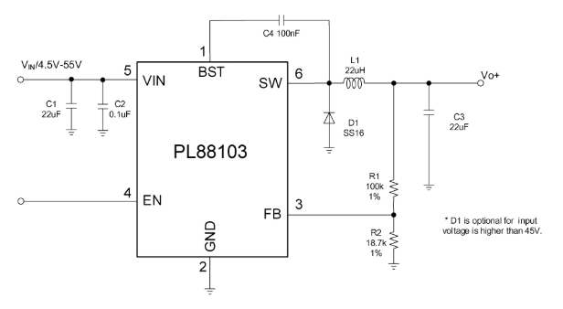 PL88103是一款单片55V,600mA降压开关调节器。它集成了一个80V 550mΩ高侧和一个80V 350mΩ低侧功率开关,以在4.5V至55V的宽工作输入电压范围内提供600mA的持续负载电流。峰值电流模式控制提供快速瞬态响应和逐周期电流限制。