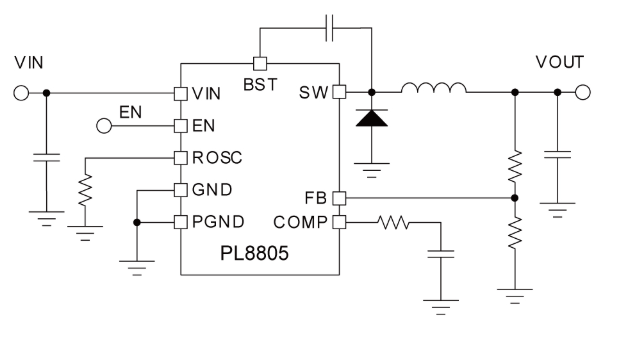 PL8805的其他特点包括超低静态电流和高轻负载效率、创新的峰值电流保护、集成的 VCC 偏置电源和引导二极管、精确的使能和输入欠压锁定 (UVLO),以及带自动恢复的热关断保护。