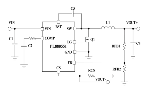 PL880551的其他特点包括超低静态电流和高轻负载效率、创新的峰值电流保护、集成的VCC偏置供电和引导二极管、精确的使能和输入欠压锁定,以及具有自动恢复的热关断保护。