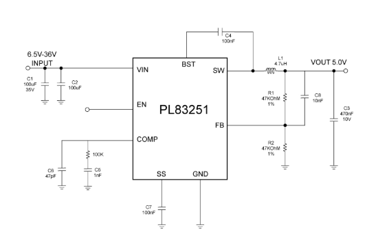 产片介绍:PL83251是一款具有CC CV控制环路的单片36V、2 4A降压型开关稳压器。PL83251集成了一个高效率同步降压开关稳压器,包括一个36V 108mΩ高侧和一个36V、102mΩ低侧MOSFET,可在6 5V至36V的宽工作输入电压下提供2 4A的连续负载电流。