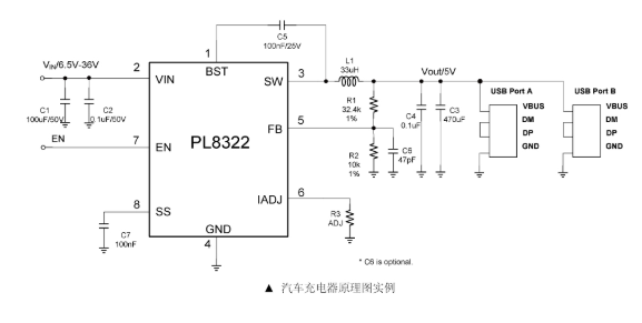 PL8322集成了高效率的同步降压开关功率管,其中包括高侧36V、76mΩ和低侧36V、52mΩ MOSFET,以提供3.1A的连续负载电流,工作输入电压范围为6.5V至30V,并具有33V的输入过压保护。峰值电流模式控制提供快速的瞬态响应和逐周期电流限制。