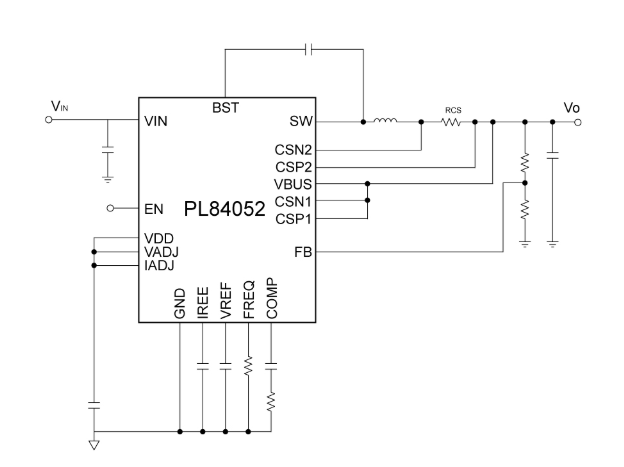 该设备还具有可编程的软启动功能,并提供各种保护特性,包括周期性电流限制、输入欠压锁定(UVLO)、输出过压保护(OVP)、热关断和输出短路保护等。PL84052提供电压控制回路、恒流回路和热调节回路。
