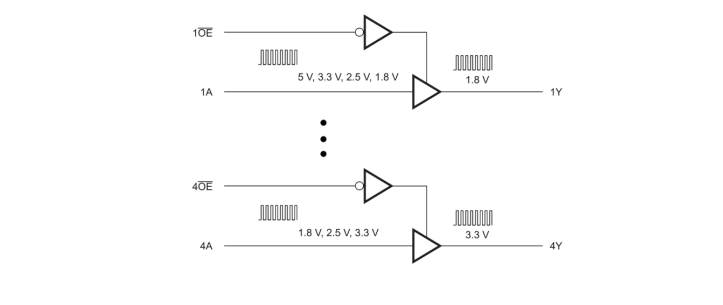 其采用了较低阀值电路来设计此输入,以便匹配Vcc =3.3V 时的1.8V 输入逻辑,并且可被用在1.8V 至3.3V 电平上行转换器功能中。此外输入端子上的5V 输入耐受可在Vcc=2.5V 时将芯片配置为3.3V 至2.5V 输出的下行转换。1.8至5.5V 的宽Vcc 范围有可能实现所需的开关输出电平连接至控制器或处理器。