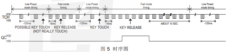 PT2043A 在低功耗模式下运行,可节省功耗,在此模式下侦测到按键触摸后会切换至快速模式,直到按键触摸释放,并保持约 10 秒快速模式,然后返回低功耗模式。
