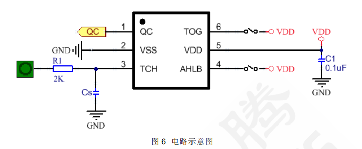 5) 可利用 Cs 电容调整灵敏度,Cs 电容值越小灵敏度越高,灵敏度调整必须根据实际应用的 PCB来做调整,Cs 电容值的范围为 1~50pF。