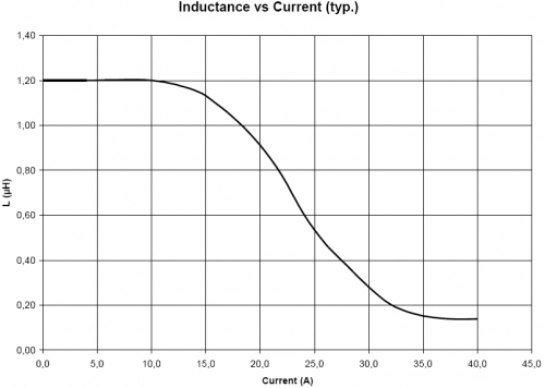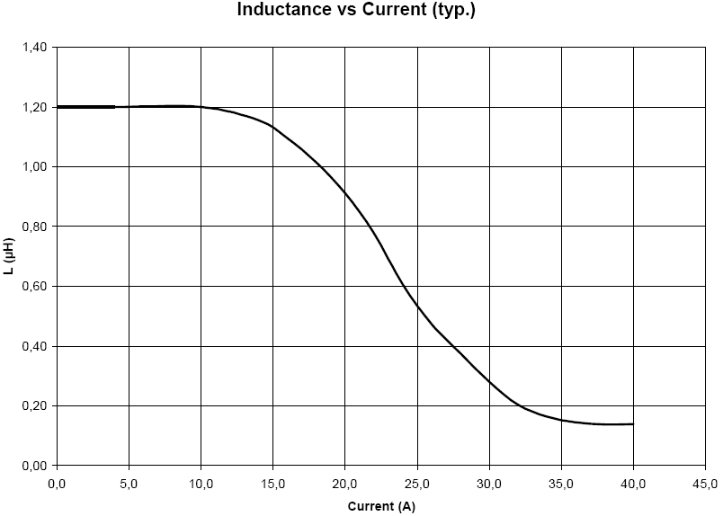 电感中直流电流的增加时,电感透磁率的数值会逐渐减少,因此电感值会缓慢下降。电感厂商会根据电感的电感值的下降程度为指标的额定电流,"基于电感值的变化率的额定电流",即Saturation Current,大部分电感厂商将电感值下降20%时的通过电感直流电流作为额定电流。下图是Wurth公司某款电感的电感值vs电流的曲线图。该款电感规格书上将saturation current设定为电感值下降10%时的电流值,为16.6A。如果将saturation current设定为电感值下降20%时的电流值的话,大约为18.2A。