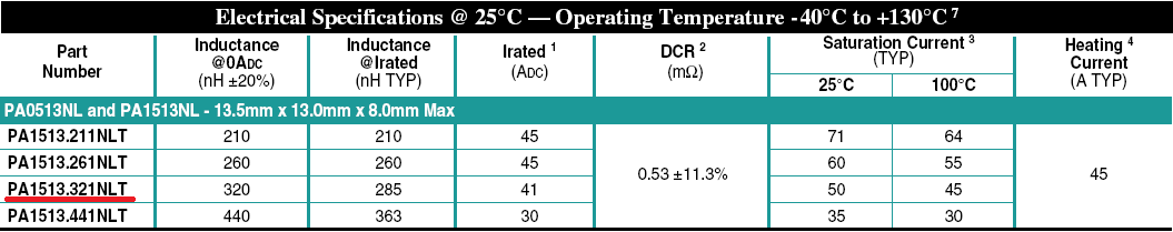 所以在实际的使用中,简单来说,一般选择两个电流值里面比较小的那个作为设计限值。比如下图中的4个PLUSE电感的 Irated,均取的Heating Current和Saturation Current其中的相对小的那个作为额定电流 。 (注意PA1513.321这个器件,为什么Irated不是45A?注意Pulse的Saturation Current定义为20%的电感值下降,41A的时候只有10%的电感值下降。)