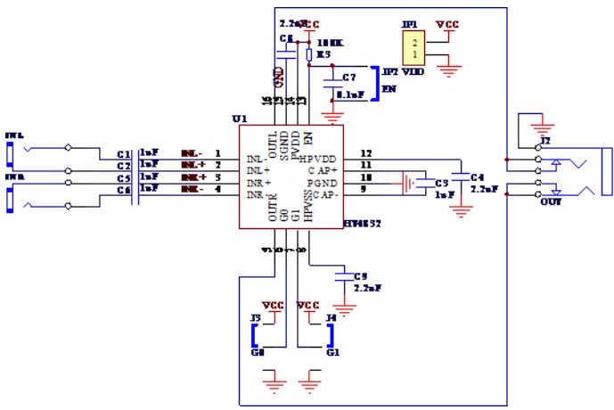 HT4832还能作为音频运算放大器,在诸如音频功放前级作差分转单端、增益补偿等功能使用。