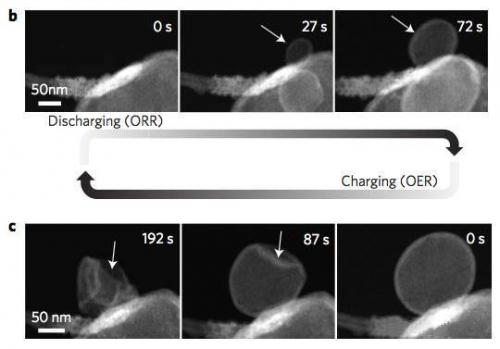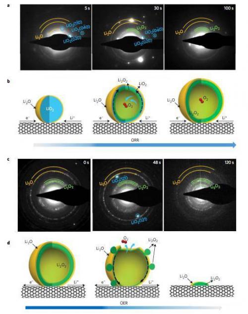 来自美国西北太平洋国家实验室的Langli Luo等人近日利用环境透射电子显微镜对全固态Li-O2电池的反应机理进行了研究,研究显示在CNT表面首先形成LiO2化合物,随后该产物发生歧化反应生成Li2O2和O2,O2的释放生成了一个外层由Li2O构成,内层由Li2O2构成的中空球状结构。目前该型研究成果已经发表在了最新的Natural Nanotechnology杂志上。