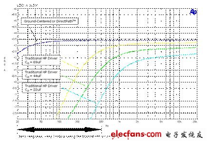 对于 100Hz 的截止频率及 16Ω 的耳机喇叭阻抗,电容必须是 110μF。对于需要小体积尺寸的情况而言,这会造成电容值及实体尺寸过大,而且使得成本过高。许多工程人员只能改用 22μF 的较小电容,不过这会影响耳机的低频率传真度,而导致低音响应不佳。