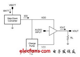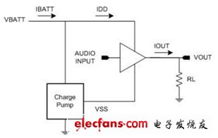 其中的技巧是设计将电池电压降低至较低电压的放大器,并使用适应性电源轨 (分别有负电源轨) 降低播放音乐时整个输出 FET 的电压降幅。其中一种实现这类放大器的方式是,使用电荷泵作为图 8 所示的步降区块。某些工程人员偏好这类做法,原因在于步降电荷泵仅需要相对较小的飞驰电容(flying capacitor) (1μF 至 2.2μF),而这也是相对较小的组件