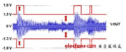 G 类放大器一般使用多个电源电压,以发挥比 AB 类放大器更高的效率。在本例中,TI 最新的 G 类 DirectPath 放大器 (TPA6140A2) 首先将电池电压降低至较低的电压值,然后切换至低信号强度的低供应电压 (1.3V),并且只有在信号强度超出该低电源电压轨时,才切换至较高的电源电压 (1.8V)。这些适应性电源电压轨的升降速度高于音频,因此可避免失真或削波。此外,由于一般聆听的音频低于 200mVRMS,因此电源电压通常是最低值 (亦即 1.3V),并且提供优于上述 AB 类放大器的效率。在音频的无噪声阶段期间,整个电源轨的电压会降低,而且信号相当小。当音频变得大声时,放大器会切换至较高的电源轨,然后切换回较低的电源轨,导致整个输出 FET 的电压降幅缩小。图 7 的红色箭头表示此电压降幅。