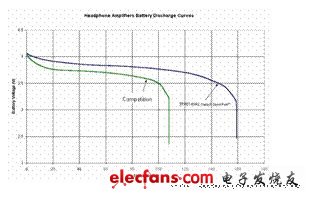 下图的 Y 轴表示电池电压,X 轴表示时间。绿线表示一般的接地置中耳机放大器,蓝线表示 G 类耳机放大器。