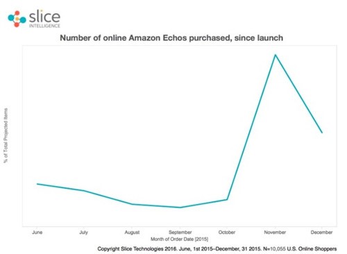 Echo 2015年销量数据走向 来源: Slice Intelligence 根据Slice Intelligence在线统计数据,从2015年10月份开始,Echo的销量迎来了一次井喷,并在11月达到了一波高潮。