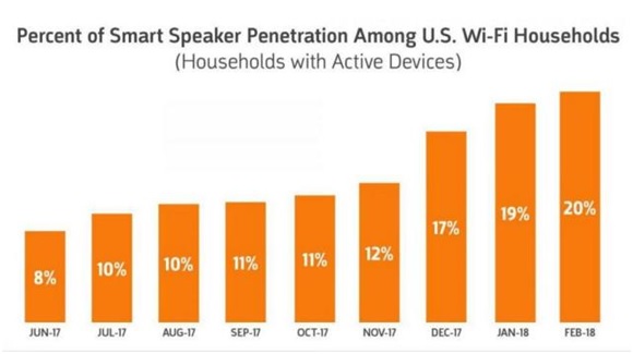 以智能音响为例,美国知名市场调研公司comScore公布最细数据显示,智能音箱在美国有Wi-Fi家庭的普及率达到了20%,从2017年12月到2018年2月之间短短3个月内,其普及率就暴增了50%,现在使用智能音箱的美国家庭达到惊人的1870万个智能音箱。随着全球消费电子风向标苹果在今年初发布智能音响Homepod,预计智能音响将进入一个更快速的增长周期。