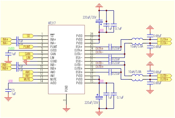 *模拟输入2×30W Class D音频功率放大器HT317