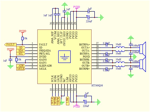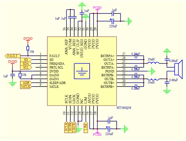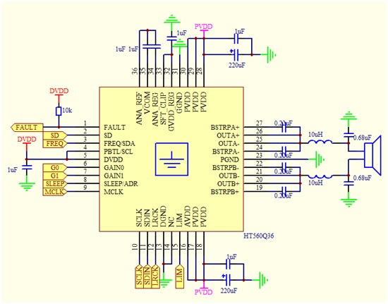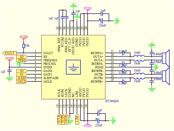 随着蓝牙音响、Wi-Fi音响和智能音响的普及,方案中涉及I2S数字音频信号的场合越来越多,因此方案对I2S输入的数字功放需求越来越大,其中TAS575x为代表性产品。然而在较多场合中,主控已具有一定的EQ等调音功能,TAS575x等产品中的EQ等调音功能即略显冗余并且不利于成本的控制;在另一些场合中,由于需要单独的较为功能全面的音频DSP进行调音,TAS575x等产品中的EQ等调音功能亦略显冗余并且不利于成本的控制。HT560正是基于这些场合,其成本严格控制,未含有EQ等调音功能,能输入数字音频信号并驱动喇叭。