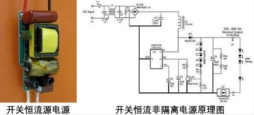 采用变压器将高压变为低压,并进行整流滤波,以便输出稳定的低压直流电。开关恒流源又分隔离式电源和非隔离式电源,隔离是指输出高低电压隔离,安全性非常高,所以对外壳绝缘性要求不高。非隔离安全性稍差,但成本也相对低,传统节能灯就是采用非隔离电源,采用绝缘塑料外壳防护。