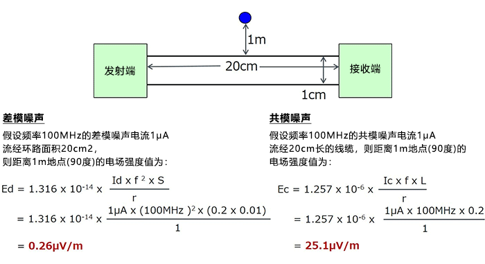 为了更好地认识每种噪声引发的辐射特点,接下来代入实际数值来计算一下电场强度*1。条件完全相同。电场强度的观测点用蓝色圆点来表示。*1:公式来源-EMC工学详解 实用降噪技法 作者Henry W.Ott-东京电机大学出版社