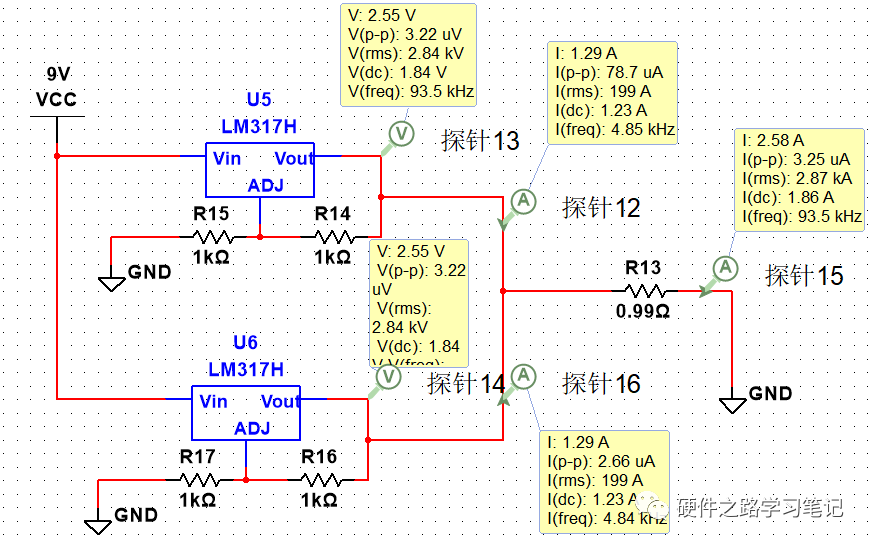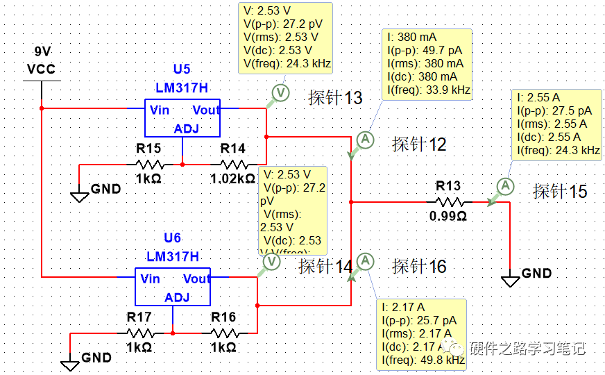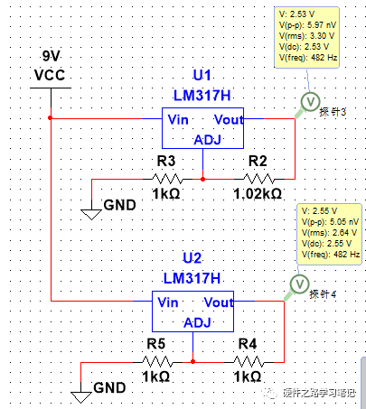 我们将这两个LDO并联介入电路,可以看到两个LDO输出电压均变为2.53V,且两者的输出电流极不均衡,原本输出电压较低的LDO负载电流为0.38A,而原本输出电压较高的LDO负载电流为2.17A。