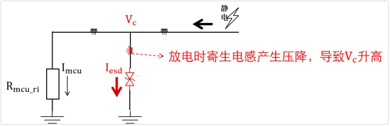 如上图,理想情况下,如果ESD管的钳位电压足够低,那么静电放电电流基本都从ESD管进行泄放。问题是,我们通常要通过PCB实现这个电路,PCB Layout走线也不是理想的,会有走线电感。