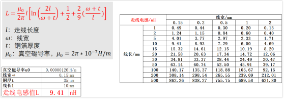 上面这个表格是我自己做了个excel表格,文末会分享给兄弟们,可以在excel里面输入对应的线宽,铜厚,线长等参数,然后就可以得到对应的电感值了,也可以看右边的表格做一个快速的估算。