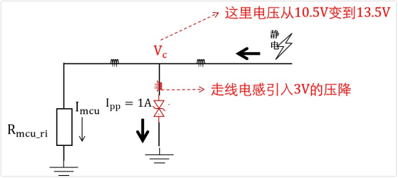 如果我们是理想Layout 的情况下(没有寄生电感),那么在ESD管泄放电流Ipp为1A的时候,钳位电压为10.5V。而如果现在Layout不好,引入了寄生电感,其50Mhz时等效阻抗为3欧姆,如果电流依然是1A,那么电感上面的压降就是3V,这样导致整体看起来,钳位电压从10.5V提到到13.5V。