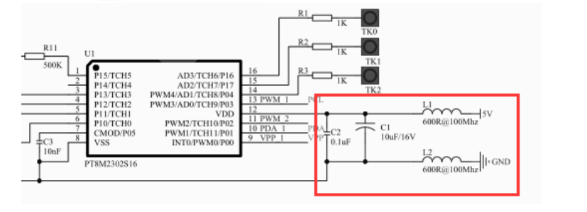 MCU 电源电路设计需预留 L1 L2 磁珠的位置。若产品无法通过 10V CS 动态测试,可加入磁