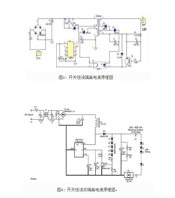 采用变压器将高压变为低压,并进行整流滤波,以便输出稳定的低压直流电。开关恒流源又分隔离式电源和非隔离式电源,隔离是指输出高低电压隔离,安全性非常高,所以对外壳绝缘性要求不高。非隔离安全性稍差,但成本也相对低,传统节能灯就是采用非隔离电源,采用绝缘塑料外壳防护。开关电源的安全性相对较高(一般是输出低压),性能稳定,缺点是电路复杂、价格较高。开关电源技术成熟,性能稳定,是目前LED照明的主流电源,