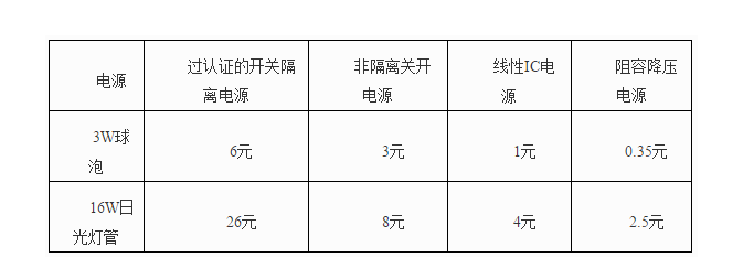 以3W小球泡和16W日光灯管为例,各种电源成本比较: