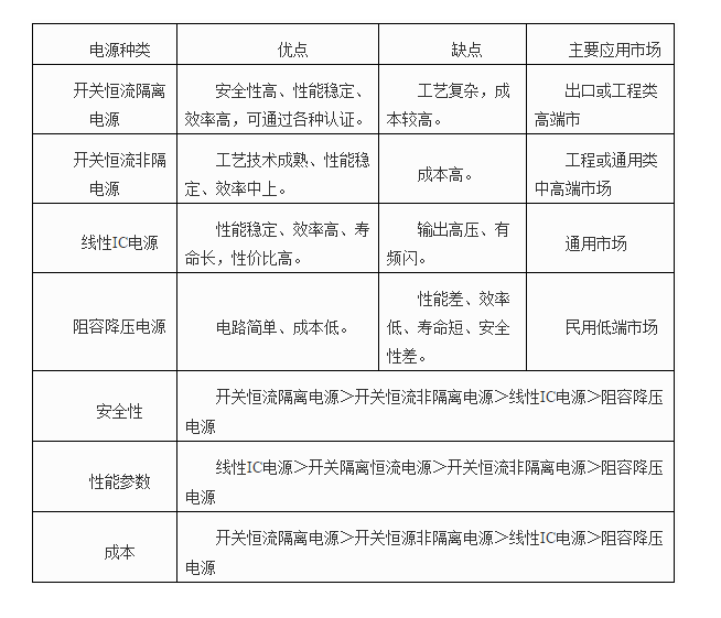 在中高端市场,开关恒流非隔离电源仍是市场的主流电源,厂家一般会在结构设计上进行防高压隔离。而在低端市场,大部份厂家是采用阻容降压电源,也有部分厂家采用线性IC电源(要求厂家有一定的设计能力)。采用不同的电源,产品的性能及价格是不一样的,我们应该根据不同的市场选用不同的产品。