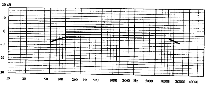 国家标准GB7313《高保真扬声器系统最低性能要求及测量方法》对音箱的最低频响要求有如下规定: 在50~12500Hz频率范围内,音箱频响特性曲线的不均匀度应符合图3所示的误差范围,将音箱频响特性曲线上平均声压级所对应的dB线与图中0dB线重合,这时音箱频响特性曲线必须在图中上下两根直线之间的范围内,即频响曲线的最高点不得比平均声压级高出4dB,最低点不得比平均声压级低8dB。倘若音箱的实际频响范围超出 50~12500Hz,声压级的误差范围仍为十4dB 和-8dB。