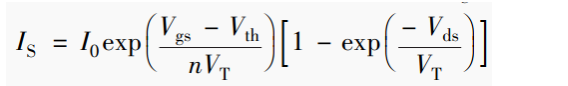 式中,VT是热电压;Vds是漏源电压;n和I0是与器件相关的常数。随着Vth减少,电流 IS增加。同时随着通道长度与氧化层厚度增加,阈值电压会减小。