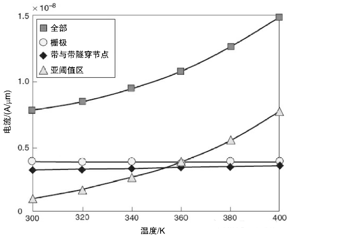 漏极和源极的耗尽区扩展到通道内时,其对电磁场和沟道内电势的影响会增大,这个叫做短通道效应(short channel effect,SCE)。当通道长度变短时,SCE将导致阈值电压的碾轧效应。因此减小器件尺寸,可以带来阈值电压的减小,随后会产生更大的亚阈值漏电流。此外, 该电流与温度具有超线性关系,如图所示,所以该电流成为电源管理中的一个重要参数。电流IG是流经栅极氧化层的电流,该电流由载流子隧道效应产生。