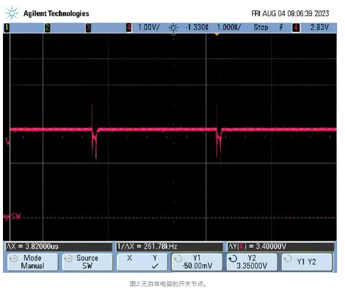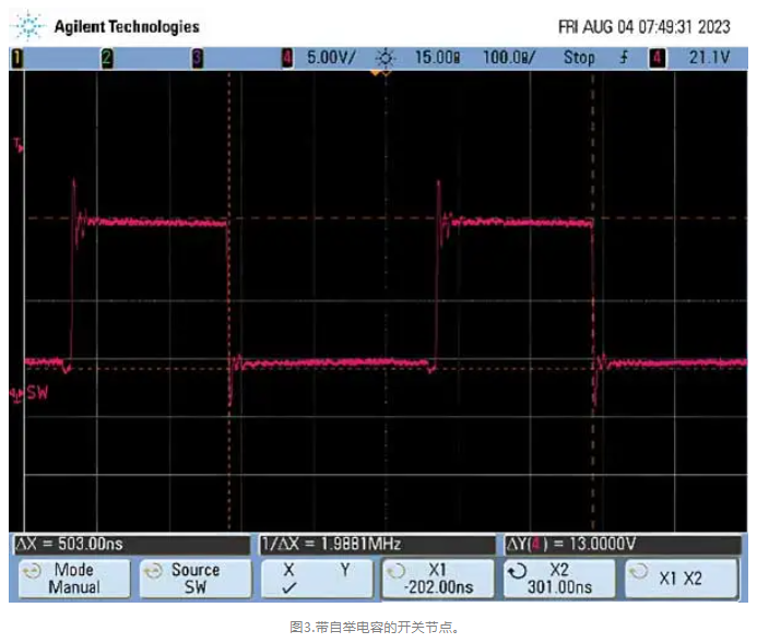 为了解决这个问题,设计人员必须添加自举电容。设计人员如果不确定要添加多大的电容,则应在数据手册示例中选择一个最接近其应用的值。如果器件需要自举电容,忘记添加该电容将导致SMPS故障。添加自举电容将能让顶部栅极驱动器有足够的驱动强度来操作处于饱和区的FET,使其充当开关,并向SW节点提供全部输入电压。这一点可以从图3中看出。