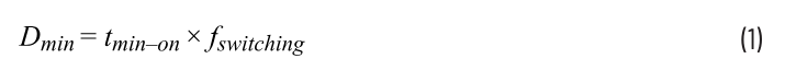 设计人员常常选择较高的开关频率以减小电路板尺寸,但由于开关损耗增加,能效比会降低。然而,当器件具有高频率和高降压比时,占空比会被迫变小,并可能降至最小占空比值以下。最小占空比如公式1所示。